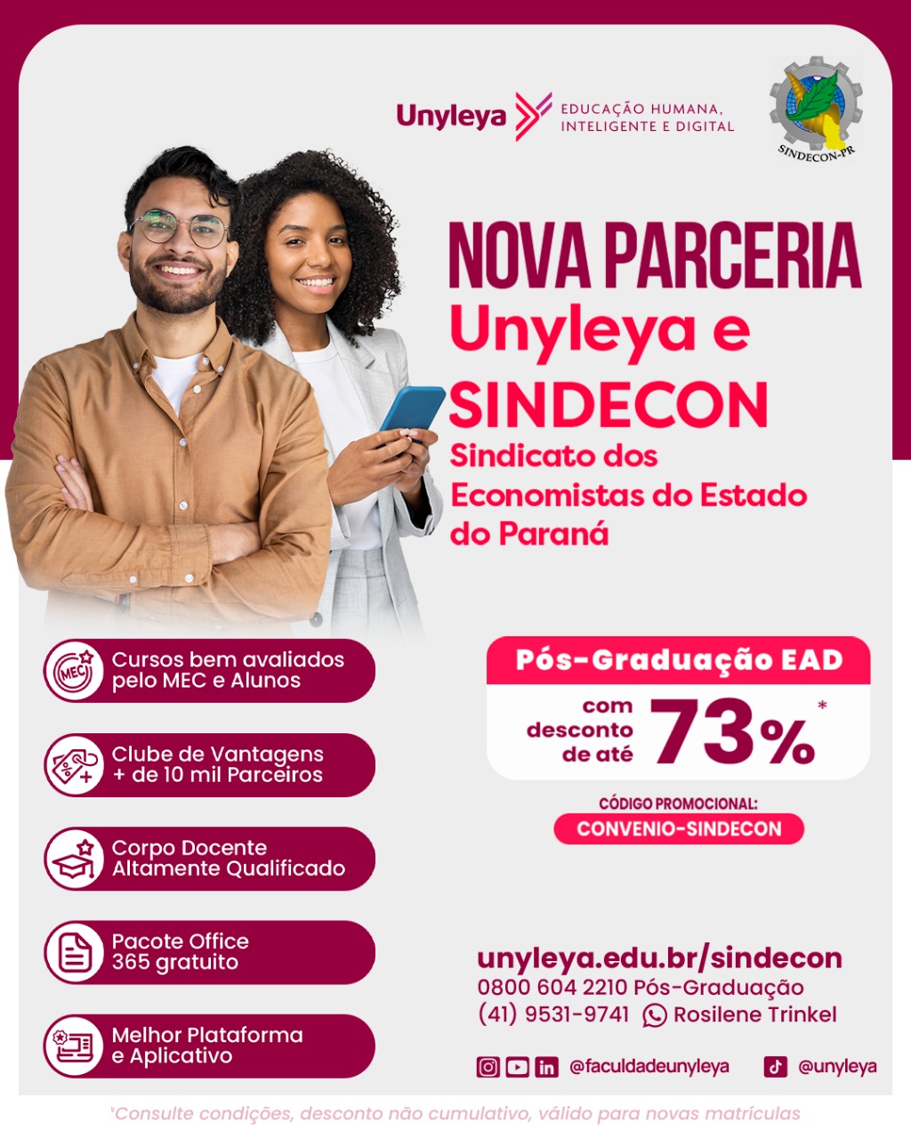 O Sindecon-PR, Sindicato dos Economistas do Estado do Paraná, tem o prazer de anunciar uma nova e importante parceria com a Faculdade Unyleya, uma das maiores instituições de ensino superior do Brasil. Essa aliança foi criada com o objetivo de oferecer aos economistas paranaenses uma gama de benefícios exclusivos, acessibilidade a cursos de qualificação e, principalmente, o aprimoramento contínuo das competências necessárias para o mercado de trabalho.