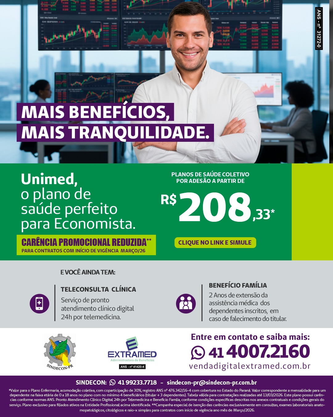 Os economistas filiados ao Sindecon-PR podem aderir ao plano de saúde da Unimed Paraná com preços diferenciados. Para fazer sua cotação, clique no link da Extramed, nossa administradora de benefícios perante a Unimed, que uma equipe entrará em contato. Ou se preferir, entre em contato diretamente com o Sindecon-PR pelo (link whatsapp), ou 41992337718.